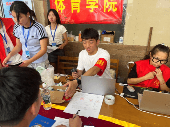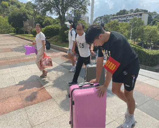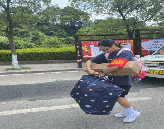 迎新现场,党员们统一佩戴党员袖标,在党员志愿者服务点集结完毕后有条不紊地开展迎新工作,为2023级新生提供入学流程办理指导、行李搬运、咨询解答、参观校园介绍等服务。