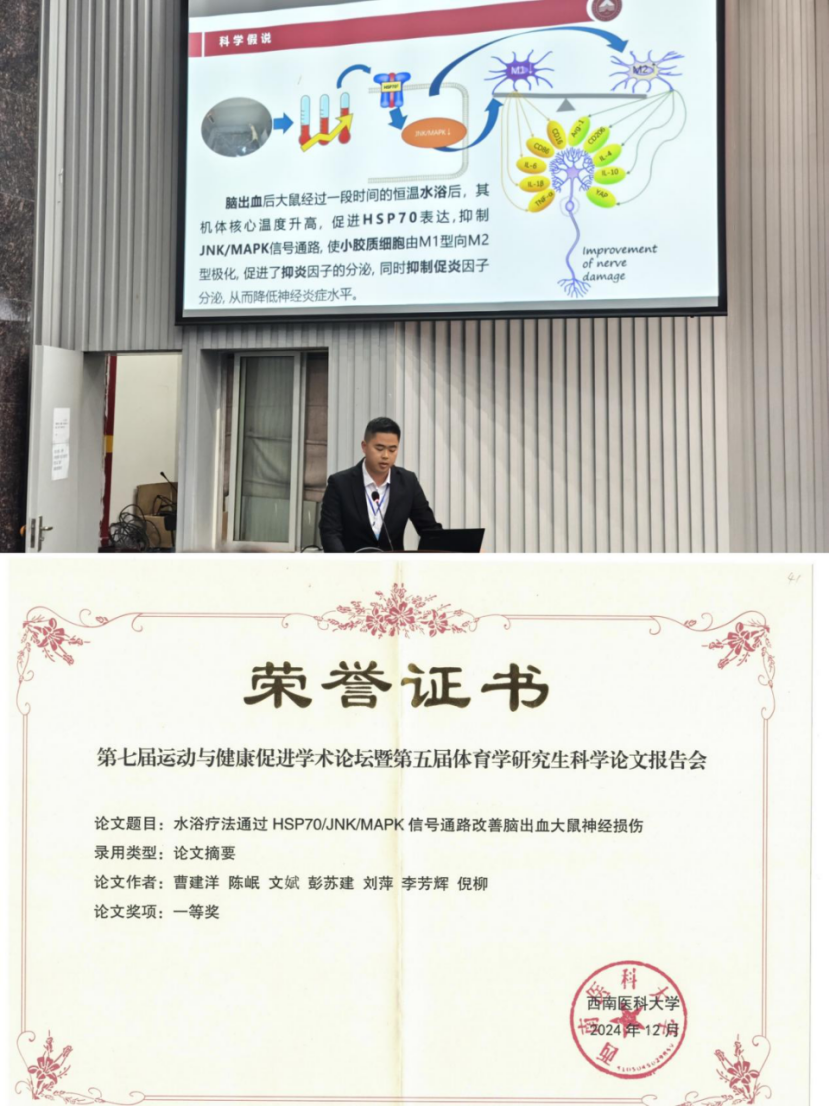在论坛期间,曹建洋老师提交的论文《水浴疗法通过HSP70/JNK/MAPK信号通路改善脑出血大鼠神经功能损伤》经过严格的筛选与评审,最终荣获一等奖。这一殊荣不仅是对曹老师个人研究实力的高度认可,也为学院增添了光彩。