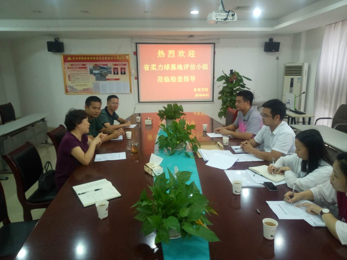 在评估的过程中,省评估专家组的领导首先对公司柔力球基地的建设给予了高度的评价与肯定,对于存在的不足也提出了合理的建议:要在基地建设方面有所创新,比如利用公众号、网络加强相关的宣传报道;建立柔力球人才库;聘请校外的柔力球高水平教练与队员等。