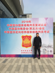 中国篮球裁判等级分为三级,二级,一级,国家级,国际级,需要层层晋升,晋升国家级难度非常大,参加考试的裁判必须是各个省市年轻裁判中的佼佼者,且要有多次参加全国比赛执裁经历。这次2019年国家级篮球裁判员选拔分为两个阶段,分别在江苏扬州和安徽马鞍山进行,刘兵老师通过体能测试(莱格尔跑86趟)、理论考试、外语考试、临场执裁层层考核,并以优异成绩成功晋升为篮球国家级裁判员。