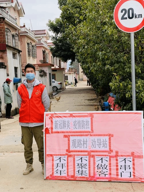 赖文琪进行防疫的主要工作是每日根据村委会安排,在观路村各路口卡点值班,对过往的人员车辆进行排查登记,对非本村居民劝返,下到村里各小组进行宣传普及防疫知识;不定期编写推文在村务群宣传。