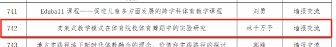 10月21日,由中国教育科学研究院、国家体育总局体育科学研究所组织实施的“中华人民共和国第一届员工(青年)运动会科学论文报告会”已完成评审工作,发布入选论文名单开始公示。青年教师林千万子写的《支架式教学模式在体育院校体育舞蹈中的实验研究》成功入选。向林千万子教师致以诚挚的祝贺!