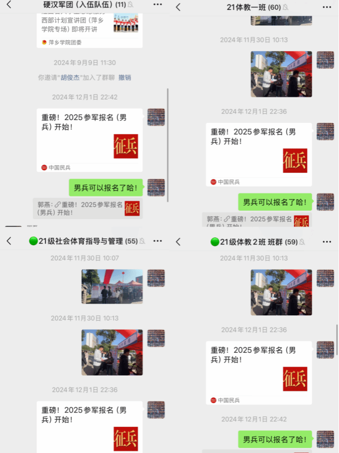 针对部分有明确入伍意向的同学,学院专门为他们组建了交流群聊,方便实时分享最新征兵动态、一对一解答个性化问题,并协助准备相关材料。此外,学院还组织有意向的同学参加学校举办的征兵专场招聘会,让大家与征兵工作人员面对面交流,更直观地了解部队生活和职业发展路径。