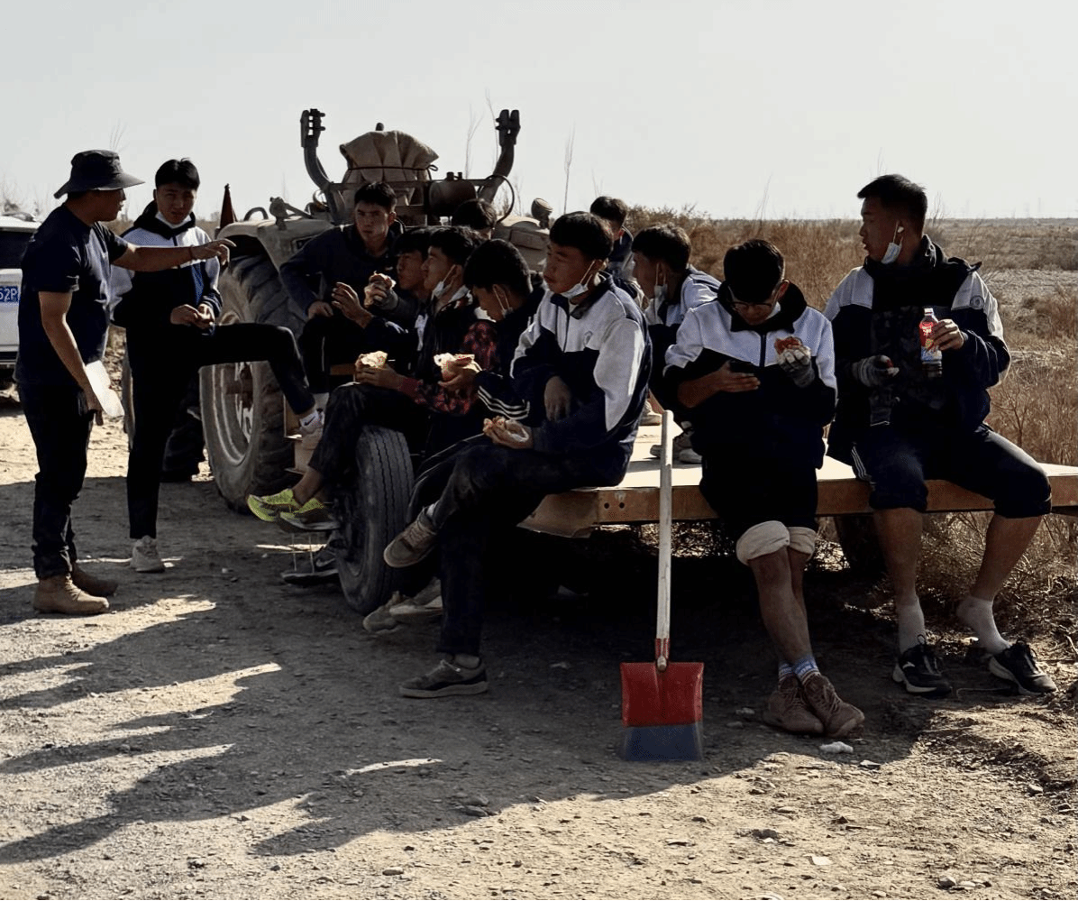 图 3义务植树间隙,员工坐在田间拖拉机上共享馕饼
