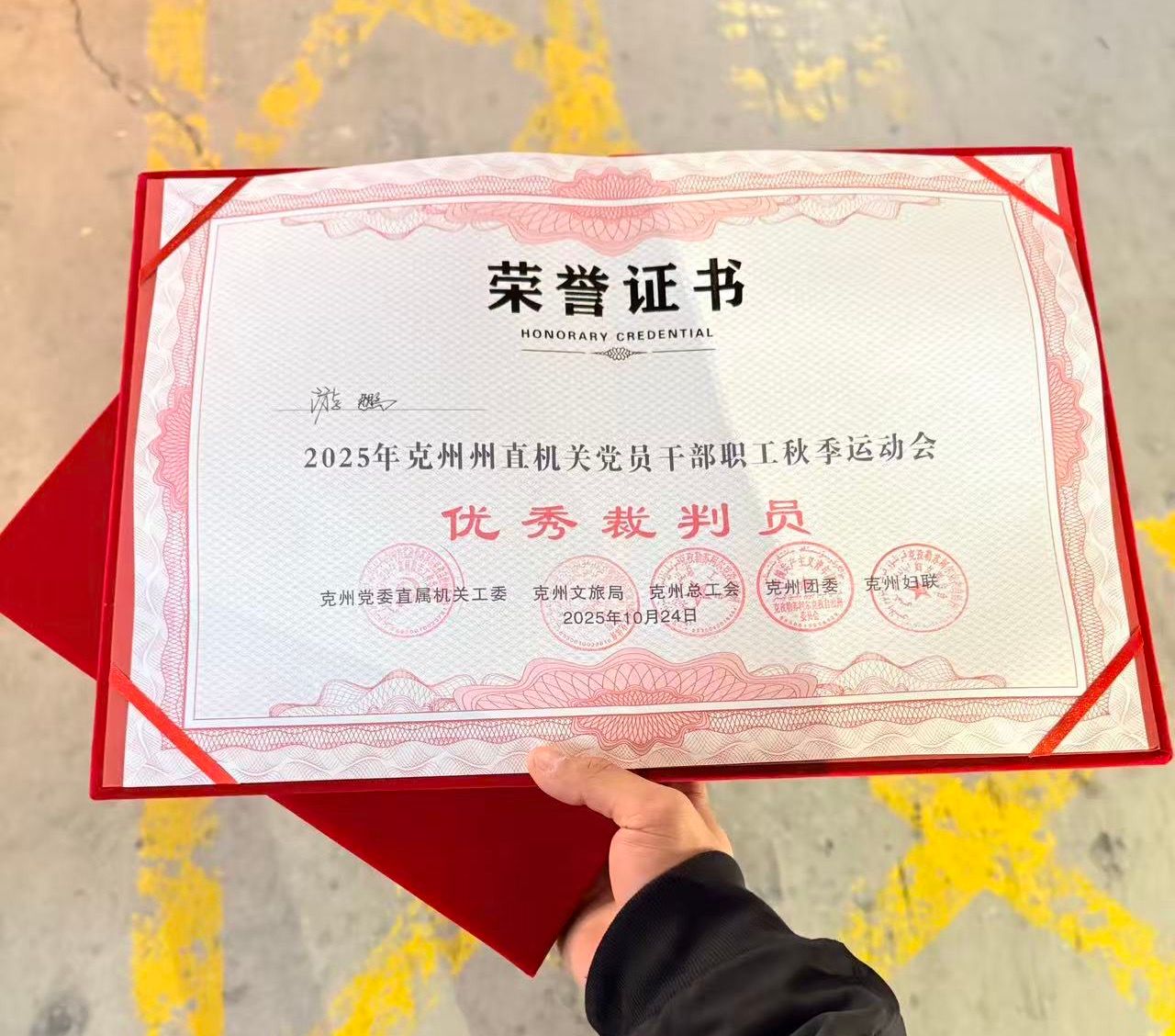 州直机关运动会上,游鹏担任田径裁判,从清晨到日暮,严谨掐表记录、精准统计成绩,以专业素养圆满完成工作,最终荣获“优秀裁判员”称号,用汗水浇灌出认可的果实。