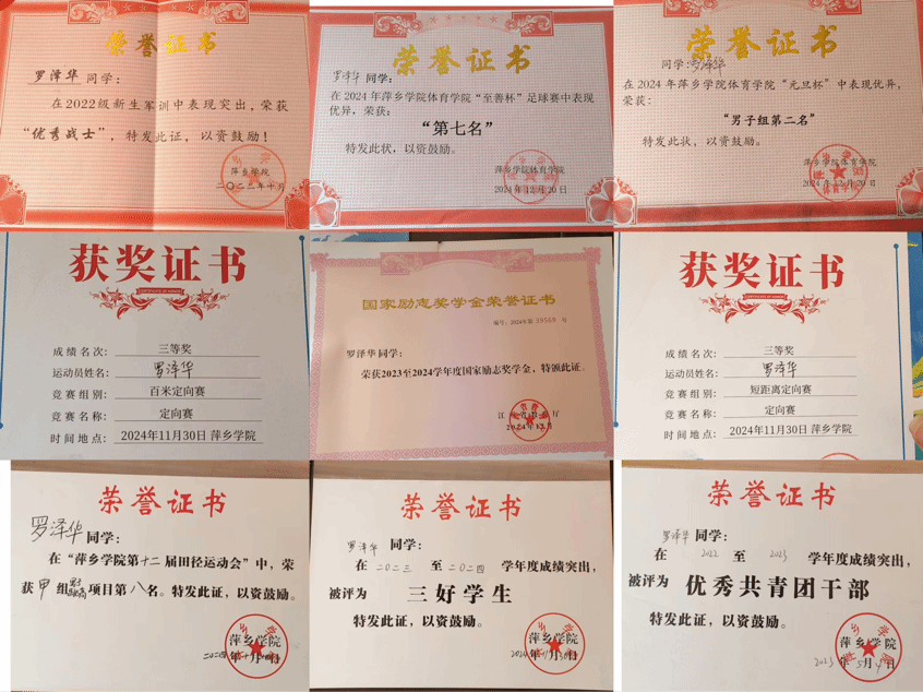 在校期间,罗泽华是一名出色的“校园骨干”:身兼班长、校健美操队与龙舟队队长,手握国家田径二级裁判员、江西省健美操二级裁判员资质,凭借优异的学业成绩与突出的综合表现,他先后获评“优秀员工干部”“三好员工”,斩获国家励志奖学金。赛场之上,他更是光芒四射,带领团队拿下全国啦啦操锦标赛第一名、省级联赛冠军等多项荣誉,用实力诠释了体育学子的拼搏与担当。