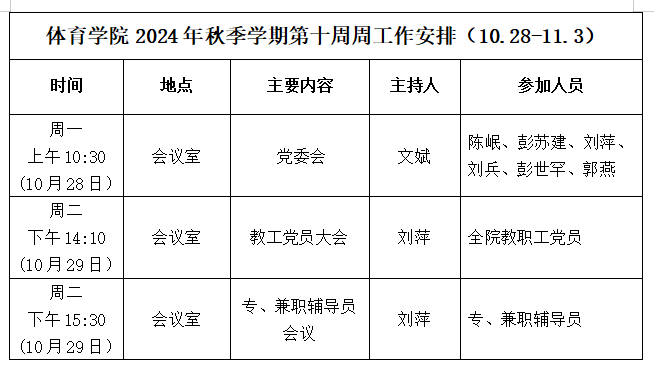 beats365唯一官方网站2024年秋季学期第十周周工作安排(10.28—11.3)