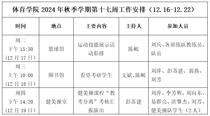 beats365唯一官方网站2024年秋季学期第十七周工作安排(12.16—12.22)