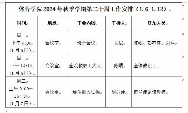 beats365唯一官方网站2024年秋季学期第二十周工作安排(1.6—1.12)