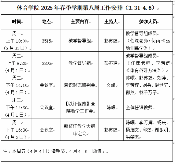 beats365唯一官方网站2025年春季学期第八周工作安排(3.31—4.6)