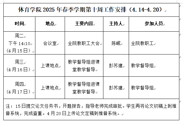 beats365唯一官方网站2025年春季学期第十周工作安排(4.14-4.20)