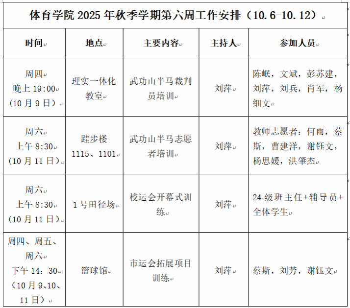 beats365唯一官方网站2025年秋季学期第六周工作安排(10.6—10.12)