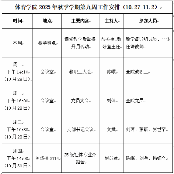 beats365唯一官方网站2025年秋季学期第九周工作安排(10.27—11.2)