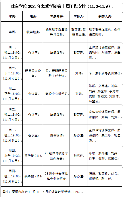 beats365唯一官方网站2025年秋季学期第十周工作安排(11.3—11.9)