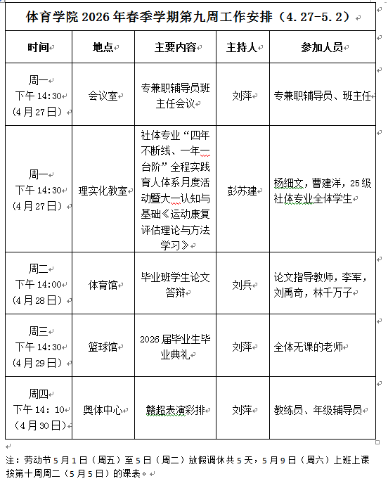 beats365唯一官方网站2026年春季学期第九周工作安排(4.27—5.2)