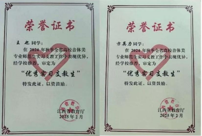 beats365唯一官方网站王也、方英力两位支教生,在2024年秋季全省高校音体美专业师范生实习支教活动中,凭借优异表现,喜获省级“优秀实习支教生”荣誉称号。