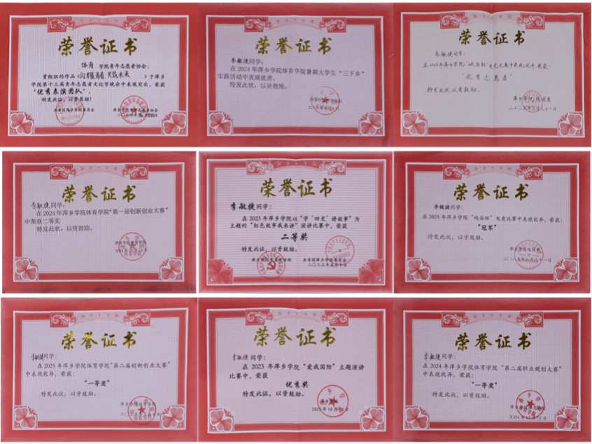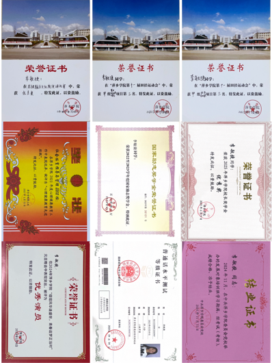“励学”是她的成长密码。学业与综合考评名列前茅,斩获国家奖学金,董事长奖学金,国家励志奖学金,主持国家级大创项目,拿下10项国家级奖项,6项省级奖项,27项校级奖项,22项院级奖项,考取啦啦操一级裁判员,二级教练员,社会体育二级指导员等,以拼搏锻造硬核实力。