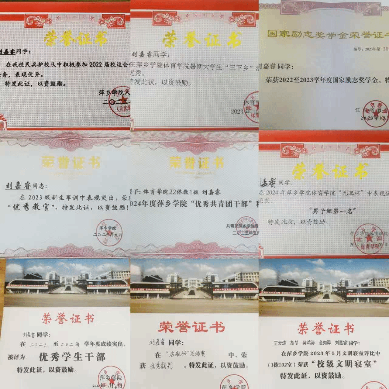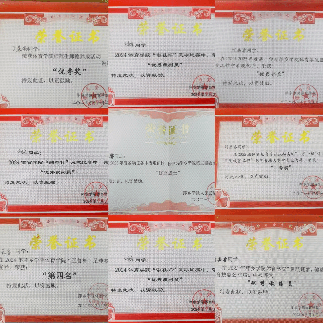 赛场之外,刘嘉睿在学业上同样保持着精益求精的态度,始终平衡好专业学习与各类实践活动,用扎实的成绩证明“全能”背后的踏实付出,先后荣获国家励志奖学金、国家奖学金。为了给未来职业发展筑牢根基,他主动考取多项核心资质证书:高级中学体育教团队格证夯实职业基础,中国足球D级教练员证书精进专业技能,萍乡市红十字会认证的AED+CPR急救证书则让他多了一份应急救援的底气与能力。
