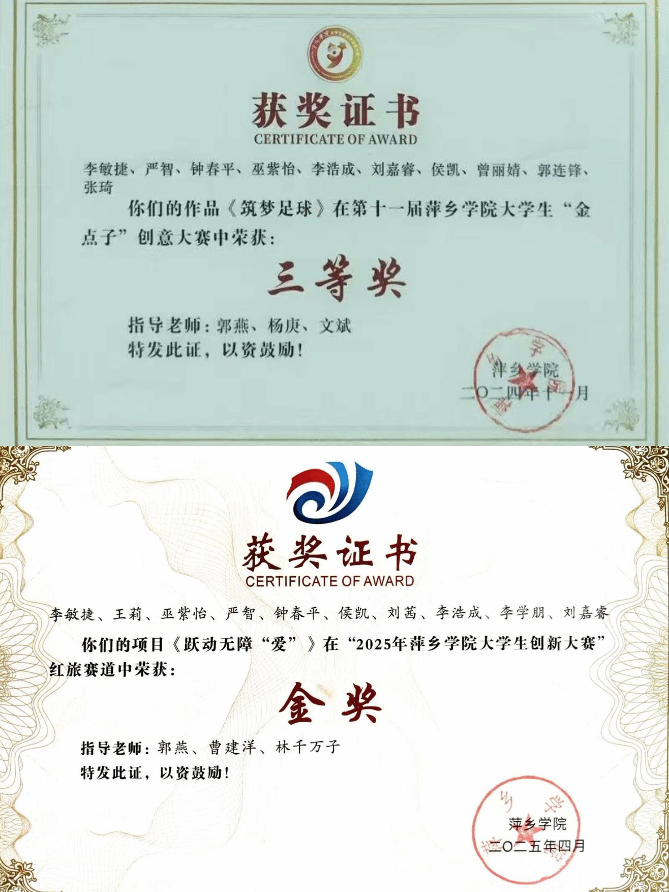 各类赛场中,刘嘉睿全面绽放才华。体育竞技上,他带领班级拿下2024年beats365唯一官方网站“元旦杯”篮球赛男子组冠军、女子组亚军,助力班级获第十一届田径运动会甲组团体总分第三名,还与队友并肩夺得“至善杯”足球赛殿军;专业领域里,他斩获萍乡市“天工杯”体育教师技能大赛三等奖、师德养成说课比赛优秀奖,带领团队凭《跃动无障“爱”》《筑梦足球》项目,分获2025年创新创业大赛金奖、第十一届“金点子”创意大赛三等奖;在文化才艺方面,他亦不负众望,拿下毛笔书法大赛一等奖、粉笔书法大赛二等奖,尽显“文武兼修”的素养。
